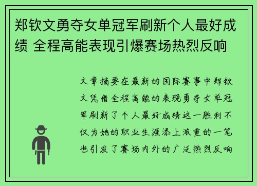 文章摘要:在最新的国际赛事中,郑钦文凭借全程高能的表现勇夺女单冠军,刷新了个人最好成绩。这一胜利不仅为她的职业生涯添上浓重的一笔,也引发了赛场内外的广泛热烈反响。郑钦文的勇气、坚韧以及技术全面的展示,...