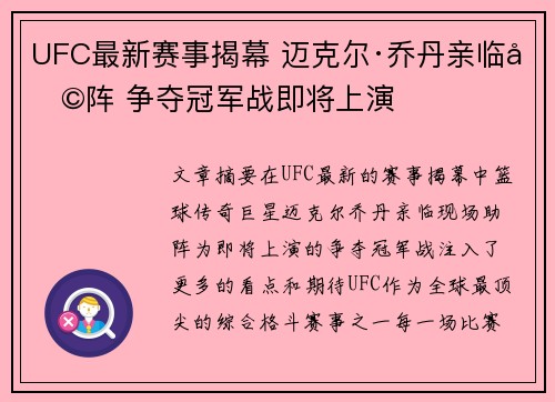 文章摘要:在UFC最新的赛事揭幕中,篮球传奇巨星迈克尔·乔丹亲临现场助阵,为即将上演的争夺冠军战注入了更多的看点和期待。UFC作为全球最顶尖的综合格斗赛事之一,每一场比赛都吸引着无数粉丝的关注。而此次...